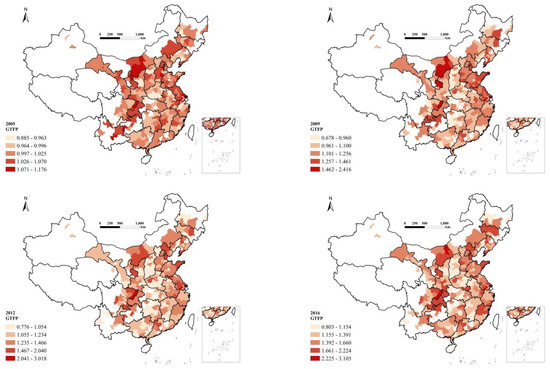 The GTFP scores of 259 cities from 2005 to 2016 were evaluated based on Equation (5) and then mapped with ArcGIS software, as shown in Figure 1.