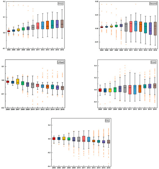 The impact of urbanization (Urban) on GTFP was basically negative throughout the study period. Moreover, the negative coefficients presented a decreasing trend, suggesting that rapid urbanization may impair GTFP improvement. A reasonable explanation for this is that large amounts of energy-consuming products such as steel and cement have been consumed during urbanization; these processes produce environmental pollution and thus reduce GTFP gains. Whereas we observe that the dispersion of the estimated coefficients changed slightly; this indicated that the impacts of urbanization on GTFP for most cities were similar. However, the downward trend reversed after 2014. One possible reason for this is that, since the National New Urbanization Planning was put forward, China has paid more attention to energy efficiency improvement and pollution emissions reduction in the process of urbanization.