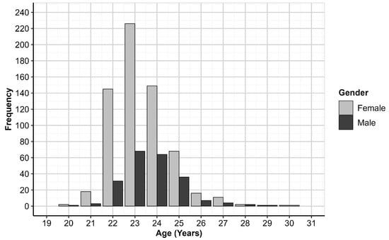 The total sample consists of 862 responses from 642 (74.59%) Females and 219 (25.41%) Males, with a mean age of 23.42 years (SD = 1.28, Range = 20–30). Whilst mean ages were comparable between genders, the distributions varied significantly between Female (Mean = 23.32, SD = 1.26, Range = 20–30) and Male (Mean = 23.69, SD = 1.31, Range = 20–29) respondents (χ (10, n = 855) =19.874, p = 0.030)—this is depicted in Figure 1.