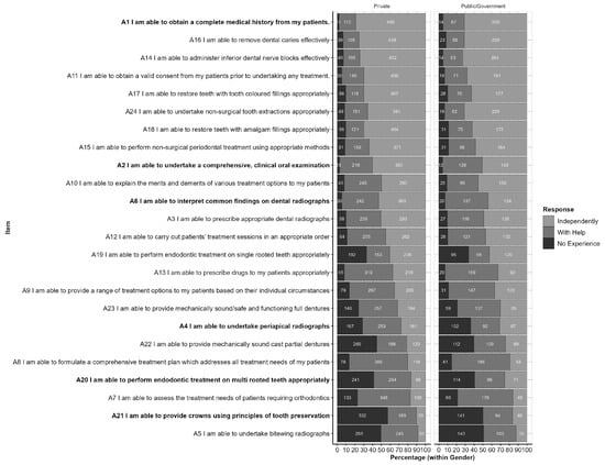 The responses to each item, by Institution Type, are shown in Figure 3. This figure is ordered from the highest to lowest proportion of responses reported as “independently,” and highlights items for which the response profile differs significantly between Private and Public Institutions (p < 0.05). These items are also listed in Table 3 along with the related p-values.
