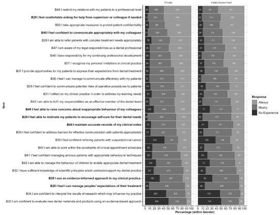 The responses to each item, by Institution Category, are shown in Figure 5. This figure is ordered from highest to lowest proportion of ‘Always’ responses and highlights items for which the response profile differs significantly between Private and Public/Government Institutions at the p < 0.05 level. These items are also listed in Table 5, along with related p-values.