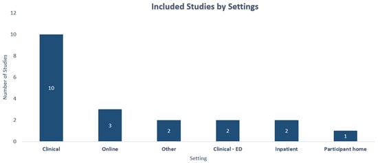 The Figure 2 below depicts the included studies by setting, with research done in a clinical context being the largest proportion (n = 10).