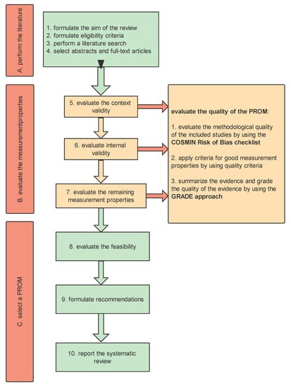 Based on the COSMIN guideline for systematic reviews of PROMs, we adapted the ‘objectives’ section of the Preferred Reporting Items for Systematic reviews and Meta-Analyses (PRISMA) 2020 27-item checklist [26,27] by changing ‘Population(s), Interventions, Comparators and Outcomes’ into ‘Construct, Populations, Type of Instruments and Measurement Properties’. We registered the systematic review in the International Prospective Register of Systematic Reviews (PROSPERO), CRD42022365247. We are conducting this systematic review based on the COSMIN guideline for systematic review PROMs and will report it following the 2020 27-item checklist. The process for conducting a systematic review of PROMs is shown in Figure 1.