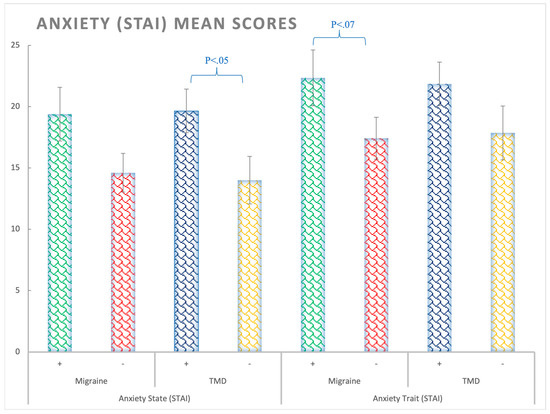 Anxiety (STAI) mean scores for state and trait subscales considering the Migraine (+,−) and TMD (+,−) Factors. Bars represent standard errors. STAI-Trait: No significant differences were observed for trait anxiety (Fs < 3.24, ps > 0.05); however, a trend to significance was observed for the migraine patients (F(1,138) = 3.24; p = 0.06; ηp2 = 0.02; θ = 0.43).