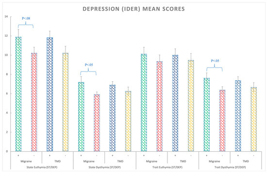 Depression (IDER) mean scores for the euthymia (similar to anhedonia) and dysthymia (negative mood, thoughts, and feelings) state and trait subscales considering the Migraine (+,−) and TMD (+,−) Factors. Bars represent standard errors.
