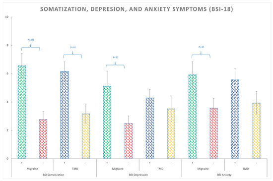 BSI-18 means scores for the somatization, depression, and anxiety symptoms in Migraine (+,−) and TMD (+,−) patients. Bars represent standard errors.