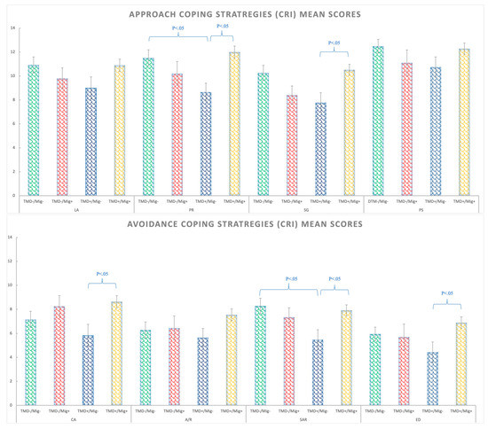 Coping strategies (CRI) mean scores for approach strategies (above) and avoidance strategies (bellow) in the TMD−/Migraine−, TMD−/Migraine+, TMD+/Migraine−, TMD+/Migraine+ groups. Abbreviations: logical analysis (LA), positive reappraisal (PR), seeking guidance and support (SG), problem solving (PS), cognitive avoidance (CA), acceptance or resignation (A/R), seeking alternative rewards (SAR), and emotional discharge (ED).
