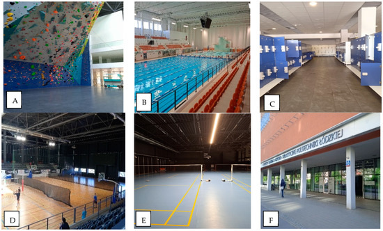 Measurements were taken in 5 different facilities of the sports centre (the climbing wall, swimming pool, changing room, basketball court, and badminton court) in 28 sampling points and in the atmospheric air outside the building (Table 1, Figure 1). The sports facility is the Academic Sports and Didactic Centre of the Technical University of Lodz, Zatoka Sportu, which was established in 2016 and hosts individual and group sports training and mass events such as the European Academic Games and Academic Sports Championships. The volume of the facility is 262,518 m3, and the height of the building is 22 m; the length and width of the facility are 171.2 m and 69.7 m; the number of storeys is 4/1 (overground/underground); and the number of seats in the auditorium is 4327. Regarding the power supply system for air-handling unit heaters in the administrative, social, and sports sections, the calculated thermal power of the installation is 625.62 kW, the total power transferred by the installation is 661.951 kW, the power supply system for heaters serving the swimming pool and the total power transferred by the installation is 459.57 kW, and the total power from the ventilation module is 1121.521 kW.