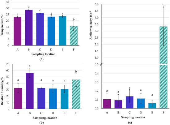 Bar chart showing averaged microclimate conditions at the selected locations; (a) temperature, (b) relative humidity, (c) airflow velocity; means marked with different lowercase letters (a−d) within the particular parameter are significantly different; ANOVA, p < 0.05; Tukey’s HSD test, p < 0.05. (A) “climbing wall”; (B) “swimming pool”; (C) “changing room at the swimming pool”; (D) “basketball/volleyball court”; (E) “badminton court”; (F) “entrance to the building”.