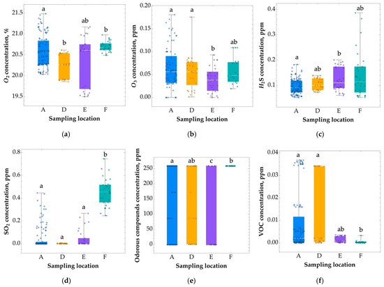 Box and whisker plots showing the averaged oxygen and chemical contaminant concentrations at the selected locations. The whiskers represent the minimum and maximum values of all the data. Results with different letters (a–c) are significantly different from each other (Kruskal–Wallis test followed by Dunn’s posthoc tests at a significance level of 0.05). (A) “climbing wall”; (D) “basketball/volleyball court”; (E) “badminton court”; (F) “entrance to the building”. VOC—benzopyrene determined using an EcoWatch sensor with a metal oxide semiconductor detector (no other compounds were detected).