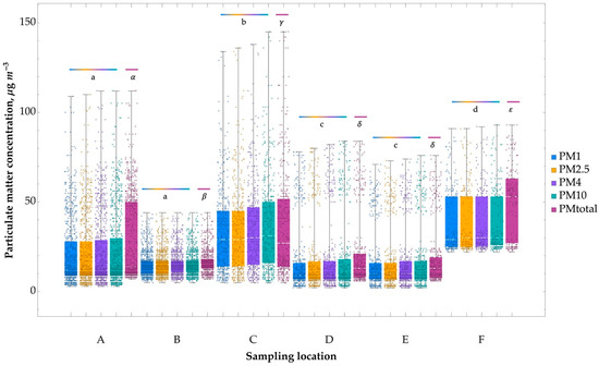 Box and whisker plot showing the particulate matter (PM) concentration at the selected locations. The whiskers represent the minimum and maximum values. Results with letters a–d (for PM1−PM10) and symbols αβγδε (for PMtotal) are significantly different from each other (Kruskal–Wallis test followed by Dunn’s posthoc tests at a significance level of 0.05). (A) “climbing wall”; (B) “swimming pool”; (C) “changing room at the swimming pool”; (D) “basketball/volleyball court”; (E) “badminton court”; (F) “entrance to the building”.