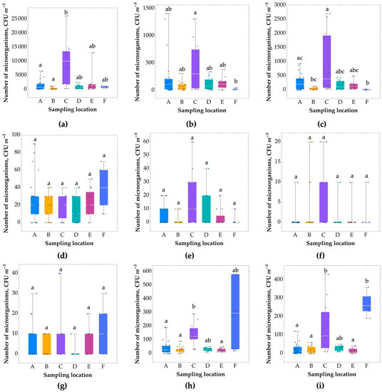Boxplot showing the microorganism numbers at the selected locations; (a) bacteria, (b) Staphylococcus spp., (c) Staphylococcus aureus, (d) hemolizujące, (e) Enterobacteriaceae, (f) Pseudomonas fluorescens, (g) promieniowce, (h) fungi, (i) xerophilic fungi. The ends of the boxplot whiskers represent the minimum and maximum values of all the data. Results with different letters (a–c) are significantly different from each other (Kruskal−Wallis test followed by Dunn’s posthoc tests at a significance level of 0.05). (A) “climbing wall”; (B) “swimming pool”; (C) “changing room at the swimming pool”; (D) “basketball/volleyball court”; (E) “badminton court”; (F) “entrance to the building”.