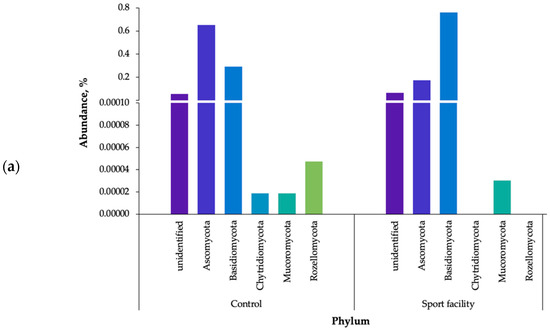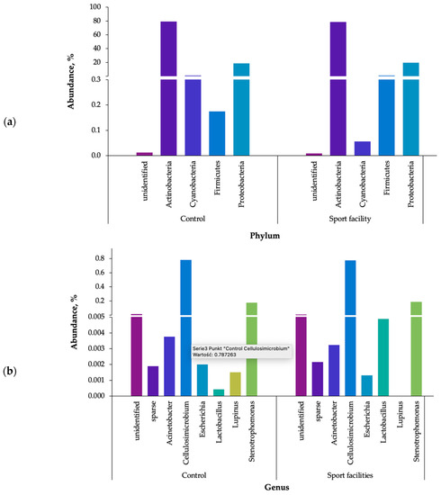 The present research is the first detailed report on the biodiversity of airborne microorganisms in sports facilities. The advantage of metagenome analysis is the identification of microorganisms directly from the test sample, skipping the cultivation stage, which prevents the loss of species of microorganisms that are non-culturable under laboratory conditions [61,62]. This method was therefore successfully used to asses biodiversity of various kinds of environmental samples [63].