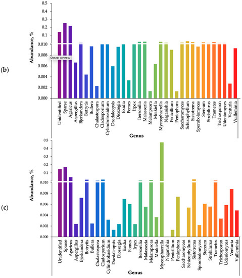 Metagenome analysis of bioaerosol samples showed greater biodiversity in terms of fungi than bacteria in both air samples. The ITS-based analysis revealed that, in total, 302 genera of fungi representing 7 phyla were detected in the analysed bioaerosol samples. The most abundant phyla belonged to Ascomycota (control air: 65.1%, climbing wall hall: 17.4%) and Basidiomycota (29.3 and 76.0%, respectively) (Figure 7a).