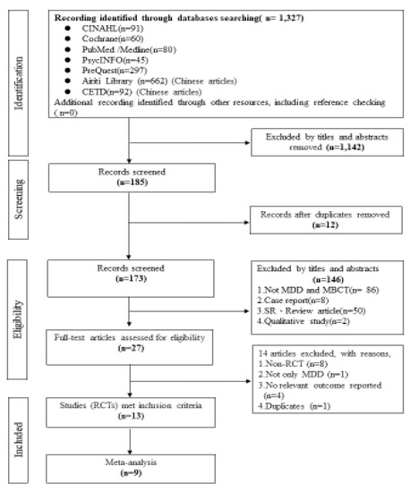 To obtain a more comprehensive review of the literature, we searched studies published in both Chinese and English from seven databases (Airiti Library, PsycINFO, CINAHL, Cochrane Library, PubMed/MEDLINE, ProQuest and the Index of the Taiwan Periodical Literature System) from the earliest available date to 31 December 2021. The search terms used were “mindfulness-based cognitive therapy (MBCT)” AND (“mindfulness-based” OR “mindfulness”) AND (“major depression” OR “major depressive disorder”) AND (“suicidal” OR “suicidal ideation”). Related articles identified in the database searches were also reviewed to identify additional pertinent studies. Only randomized controlled trials that examined MBCT for adults with major depressive disorder were included in the analysis. Duplicate publications, qualitative studies, and review articles were excluded. Figure 1 illustrates the search and selection process used in this study.