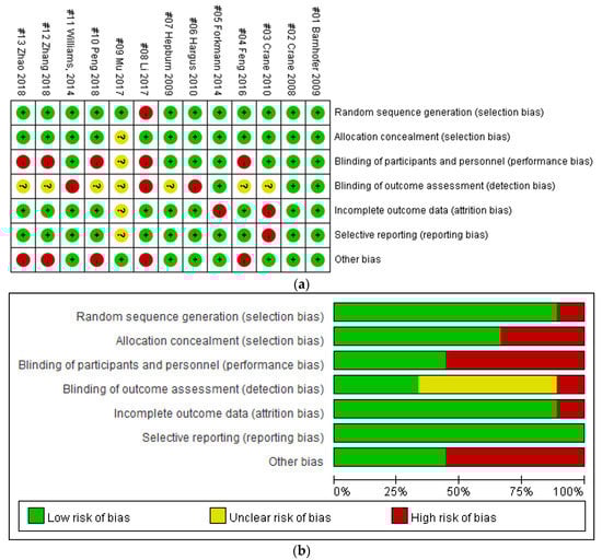 The risk of bias for each study is shown in Figure 2. Specifically, 77% (10/13) of the studies presented high risks of detection bias; 77% (10/13) presented high risks of detection bias and attrition bias; 38% (5/13) presented a high risk of performance bias; 15% (2/13) presented high risks of attrition bias, 7% (1/13) presented a high risk of bias in allocation concealment (selection bias); 7% (1/13) presented a high risk of reporting bias; and 7% (1/13) presented a high risk of bias in random-sequence generation (selection bias). Furthermore, 62% (8/13) of the studies had no other significant potential source of bias and 38% (5/13) showed heterogeneity of one or two basic attributes, which may have caused bias in the estimation of intervention effectiveness. Because 11 of 13 (85%) articles lacked selective reporting problems, the risk of reporting bias was low. In general, the overall quality of the 13 studies included in this paper was relatively high. Although this review included only randomized trials, 12 of the trials [7,22,23,24,25,26,27,28,30,31,32,33] contained sufficient methodological details for low risk of selection bias, while one trial [22] did not specify the inclusion and exclusion criteria, and was therefore considered to have a high risk of selection bias. Seven trials [7,22,23,26,27,28,33] described the use of random sequences for grouping, and so were at low risk for covert grouping, while the remaining 10 trials [7,24,25,26,28,29,30,31,32,33] did not report the detailed methods for randomization and were considered to be at high risk for hidden grouping. Seven trials [7,22,23,26,27,28,33] described the use of envelopes to achieve blinding and so were at low risk of performance bias, while the authors of the remaining five trials did not describe blinding in depth. Based on method descriptions, all studies were deemed to have low risk of detection bias. Three trials [23,30,33] reported patient drop-outs during the study period and so were considered to be at low risk of attrition bias, while drop-out rate was unclear in the remaining trials, which were therefore deemed to be at high risk of attrition bias. All trials provided sufficient details on patient characteristics to be considered at low risk of reporting bias.
