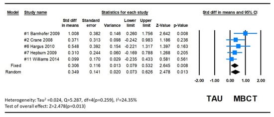 Depression as measured by the BDI-II Questionnaire showed a significant decrease after Mindfulness-Based Cognitive Therapy (MBCT) intervention in five studies [13,22,26,27,28]. The results of heterogeneity were examined by using Comprehensive Meta-Analysis (CMA), an analysis software package with an easy operation interface and enough power to meet the research needs. Meta-analysis is a statistical procedure that combines data from multiple studies. When a treatment effect (or effect size) is consistent across studies, a meta-analysis can be used to identify currently prevalent effects and changes in effect from one study to the next. Meta-analysis can be used to determine the reasons for the changes. The pooled standardized mean difference (SMD) between groups was 0.349 (95%CI = 0.073 to 0.626), and this overall effect was statistically significant (Z = 2.478, p = 0.013). Since variations in depression are complex, the heterogeneity between studies was significant (Q = 5.287, p = 0.259, I2 = 24.346), as determined by the random-effects model. The combined results indicate that the MBCT group had lower depression than the control group. The forest plot is displayed in Figure 6.