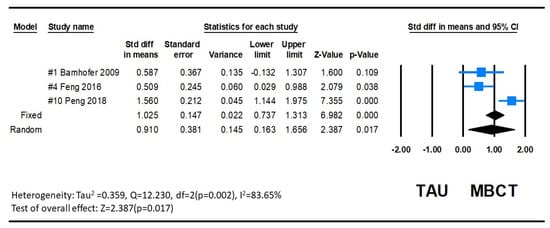 Only three studies included suicidal ideation as an outcome variable. Suicidal ideation was measured using the Beck Scale for Suicide ideation (BSS) showing a significant decrease after MBCT intervention in these three studies [22,25,31]. The pooled SMD between groups was 0.910 (95% CI: 0.145 to 0.163), and this overall effect was statistically significant (Z = 2.387, p = 0.017). Since variations in suicidal ideation are complex, the heterogeneity between studies was significant (Q = 12.230, p = 0.002, I2 = 83.647), as determined by the random-effects model. The combined results indicate that the MBCT group had lower suicidal ideation than the control group. The forest plot is displayed in Figure 8.