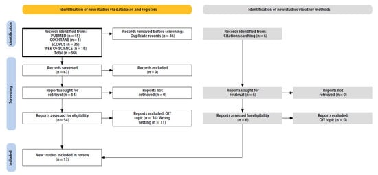 The electronic database search identified a total of 99 studies (PubMed n = 45, Cochrane n = 1, Web of Science n = 18, and Scopus n = 35). After removing duplicates, 53 studies remained. Six more pertinent articles were added by looking over the reference list of acceptable publications. A total of 36 articles were excluded because they were off-topic, 9 were not available, and 2 were animal studies. The study selection and process are summarized in Figure 2. After a full-text review, a total of 13 studies met the inclusion criteria. A summary of the characteristics of each study included is presented in Table 2.