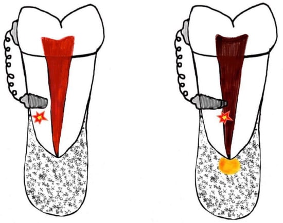 - McCabe, P.; Kavanagh, C. Root Perforation Associated with the Use of a Miniscrew Implant Used for Orthodontic Anchorage: A Case Report. Int. Endod. J. 2012, 45, 678–688. [Google Scholar] [CrossRef] [PubMed]