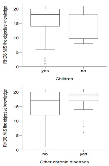 The Mann–Whitney U test showed that respondents’ objective knowledge showed statistically significant (p < 0.05) differences in terms of objective knowledge between people with and without children, as well as differences between people suffering from other chronic diseases and people without such diseases.
