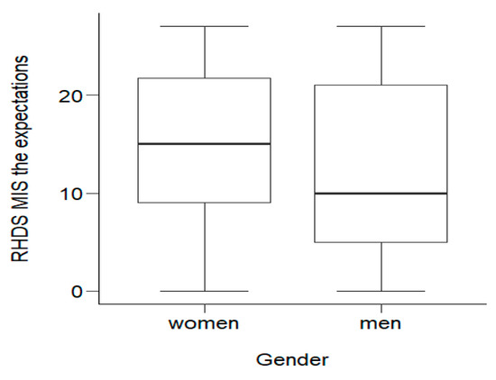 Statistical analysis showed statistically significant (p = 0.023) differences in the level of expectations between men and women. Half of the women obtained a score no lower than Me = 15.00. The lowest score among this group was Min = 0.00, and the highest was Max = 27.00. Half of the men scored no more than Me = 10.00. The lowest score was Min = 0.00; the highest was Max = 27.00. Women obtained statistically significantly (p < 0.05) higher scores on the expectations scale, and thus felt significantly less need to obtain additional information about their disease and its treatment. The distribution of variables is shown in Figure 2.