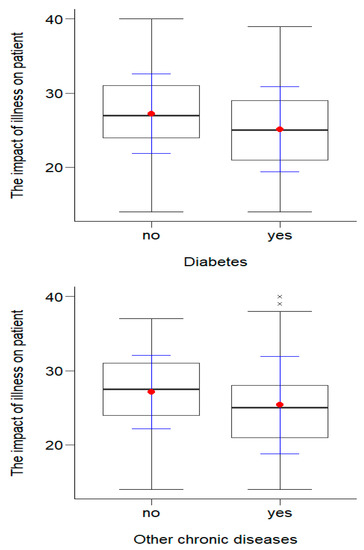 The t-test for independent trials showed statistically significant (p < 0.05) differences in the illness’ level of impact on the patient depending on the presence of diabetes (p = 0.007) and other chronic diseases (p = 0.043). The results in terms of disease impact among people without diabetes M = 27.23 (SD = 5.36) and other diseases M = 27.13 (SD = 4.97) were statistically significantly (p < 0.05) higher than those for people suffering from diabetes M = 25.12 (SD = 5.74) or other chronic diseases M = 25.38 (SD = 6.56). This means that, among people who did not have diabetes or other chronic diseases, the disease had a significantly lower impact on functioning in the chronic illness. The results are presented in Figure 3.