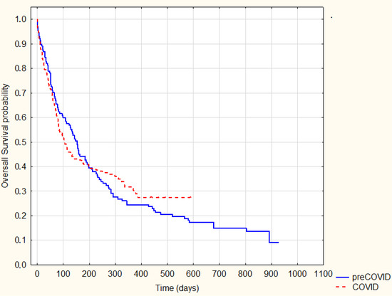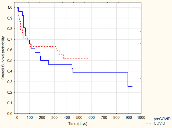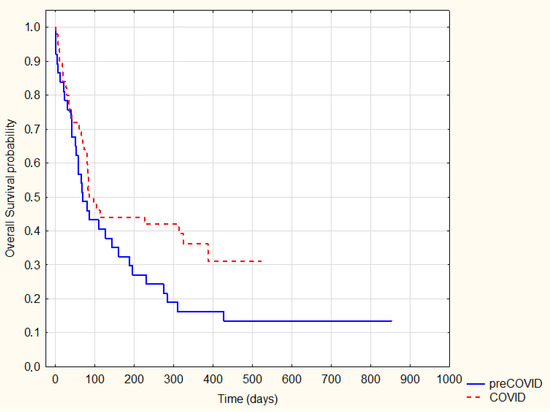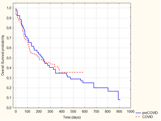 Figure 4. Kaplan–Meier Survival Analysis—radical treatment pre-COVID-19 vs. COVID-19, log-rank p = 0.6.