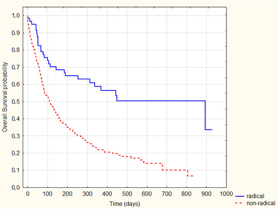 As expected, patients treated radically were characterized by significantly longer survival (log-rank p = 0.0001) (Figure 2). However, there was no significant difference in survival between the analogous groups (radically and non-radical treated) in the pre-COVID-19 and COVID-19 periods (p = 0.89 and p = 0.6, respectively) (Figure 3 and Figure 4).