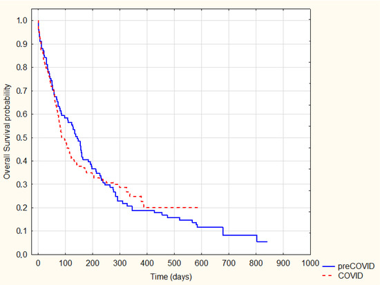Figure 3. Kaplan–Meier Survival Analysis—non-radical treatment pre-COVID-19 vs. COVID-19, log-rank p = 0.89.