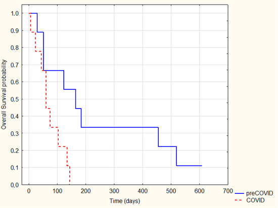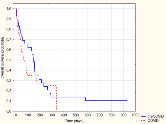 Figure 5. Kaplan–Meier Survival Analysis—adenocarcinoma pre-COVID-19 vs. COVID-19, log-rank p = 0.07.