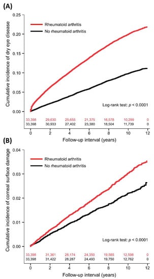 Cumulative incidence of dry eye disease (A) and corneal surface damage (B) between patients with and without rheumatoid arthritis with number of subjects at risk.
