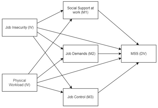 Figure 1. Hypothesized parallel mediation model. IV: Independent Variable; M: Mediator; MSSs: Musculoskeletal Symptoms.