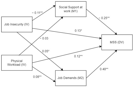 Regarding Hypothesis 1, the results obtained from the mediation model show that the total effect is significant for both independent variables. For job insecurity (IV), high scores evince an increase in scores on MSSd (DV) (β = 0.179, p < 0.01). The same relationship is established on total effects when the IV relates to physical workload (β = 0.171, p < 0.01) (Table 4). When analysing the direct effects of both independent variables on MSSs, they are significant, which indicates there are more unknown mediating variables for this relationship. The direct effect for the job insecurity IV is β = 0.124 (p < 0.05) and for physical workload IV 0.123 (p < 0.01) (Table 5). Overall, the mediation model presented, with the two predicting and mediating variables, explains the 12.7% (R2) variance on the MSSs scores. The analysis of the total effect estimators shows that the relevance of both variables on musculoskeletal symptoms is similar in the model.