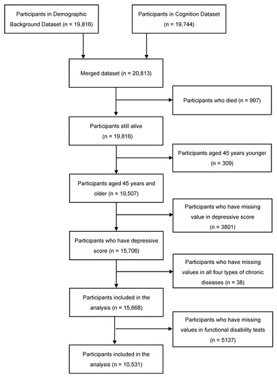 Data were drawn from the fourth wave (2018) survey of China Health and Retirement Longitudinal Study (CHARLS) dataset. The CHARLS dataset is an ongoing longitudinal study led by the National School of Development in Peking University. This dataset includes middle-aged and elderly adult participants aged 45 years and older using probability proportional to size (PPS) sampling in 150 counties, 450 communities/villages from 28 provinces of mainland China [22]. The surveys were conducted every 2 to 3 years, with a total of four waves from 2011 to 2018. Data were be excluded if participants died during the year selecting data. All participants were interviewed in-person at their homes. The fourth-wave survey was used in this analysis, in which we merged the Demographic Background dataset and Health Status & Functioning dataset of subjects. The inclusion criterion was: the participant is aged at least 45 years old. Participants who have missing values in self-reported depressive score or all four types of chronic diseases, and all kinds of functional disabilities were excluded.