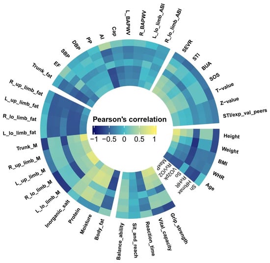 Relationships of all Non-In data with seven exercise data in cyclic heat map. The correlation data represented by each sector in the circle correspond to Table 1 and are divided into five main categories in the same way. Some variable names have been abbreviated for graphic aesthetics. R_, Right; L_, Left; lo_, lower; up_, upper; M, muscle; exp_val_peers, expected value of peers.