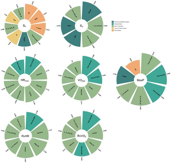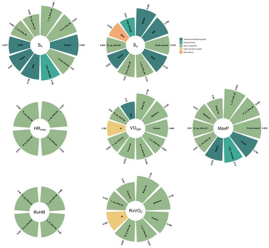 Interestingly, we found that most of the body composition data with high correlations to power (max power) and power-related data (Sh, So) were about muscles (trunk and limb muscles), while most of the body composition data with high correlations to other exercise data (VO2pk, HRmax, RvVO2, RvHR) were about fat. This may be due to the fact that performing work (power) is a conversion of energy by the body to the outside world through exercise (the body consumes heat and converts it into external mechanical energy), while VO2pk, HRmax, etc., are intrabody indicators of the body in exercise, but this still requires subsequent research. Of course, the significance of such results may also be limited because our sample was limited, with only two obese individuals (BIM ≥ 30) and three lean individuals (BMI ≤ 18.4) in our experimental population, and all just over the threshold.