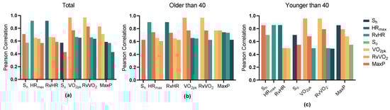 Details of the relationship between all types of data in exercise data with the significant relationships (p < 0.001) and divided into three sets based on age. (a) Total; (b) Older than 40; (c) Younger than 40.