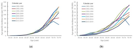 - Xie, L.; Qian, Y.; Liu, Y.; Li, Y.; Jia, S.; Yu, H.; Wang, C.; Qian, B.; Bao, P. Distinctive lung cancer incidence trends among men and women attributable to the period effect in Shanghai: An analysis spanning 42 years. Cancer Med. 2020, 9, 2930–2939. [Google Scholar] [CrossRef] [PubMed]