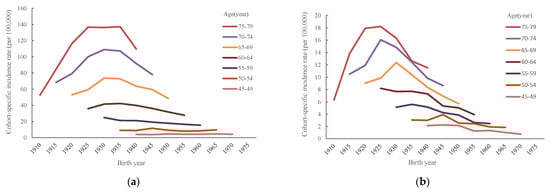 - Rosenberg, P.S.; Check, D.P.; Anderson, W.F. A web tool for age-period-cohort analysis of cancer incidence and mortality rates. Cancer Epidemiol. Biomark. Prev. 2014, 23, 2296–2302. [Google Scholar] [CrossRef]