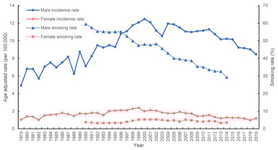 - Au, J.S.; Mang, O.W.; Foo, W.; Law, S.C. Time trends of lung cancer incidence by histologic types and smoking prevalence in Hong Kong 1983–2000. Lung Cancer 2004, 45, 143–152. [Google Scholar] [CrossRef]