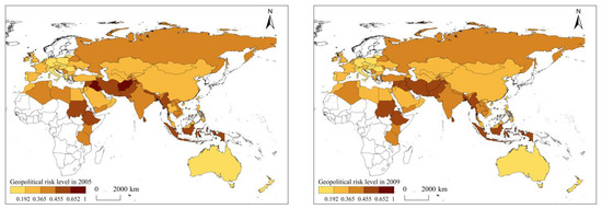 It is worth noting that the Belt and Road Initiative is an important turning point in the evolution of geopolitical risk (Table 2). The average geopolitical risk of countries along the Belt and Road was 0.330 in 2005–2013, and the average geopolitical risk of countries along the Belt and Road was 0.356 in 2013–2020. After 2013, the geopolitical risk of 27 countries changed from negative growth to positive growth, which further indicates that the geopolitical risk situation of the countries along the Belt and Road tended to deteriorate. According to the geopolitical risk ranking in Table 2, the countries with geopolitical risk increases of more than 0.075 were Syria, Yemen, Libya, Thailand, Turkey, Egypt and Ireland in 2005–2013, and the countries with geopolitical risk increases of more than 0.08 were Myanmar, Yemen, Tunisia, Ukraine, Jordan, Germany and New Zealand in 2013–2020 (Table 2). The countries with the largest increases in geopolitical risk were Syria and Yemen, where geopolitical risk increased by a factor of 1.442 and 1.467, respectively. The multiple dilemmas of military conflict, ethnic strife, political unrest and economic stagnation brought about by the Syrian war and the Yemeni civil war spiked sovereign and military risk in both countries. Iraq was the country with the largest decline in geopolitical risk from 2005–2020, but Iraq’s geopolitical risk was always at a high risk level (Table 2). The geopolitical risk situation in Iraq has slowed down since the end of the Iraq War. However, the political turmoil caused by sectarian conflicts between Shiites and Sunnis, the military conflicts and armed threats brought about by the Kurdish independence movement and the frequent terrorist attacks by the “Islamic State” extremist organizations have all kept the geopolitical risk in Iraq high. It is worth noting that geopolitical risk in both Russia and Ukraine continued to rise after the 2013 Ukraine crisis, jumping from the medium risk level to the high risk level, which indicates that the political and economic security turmoil brought about by the Ukraine crisis has had a sustained impact on geopolitical risk in Russia and Ukraine.
