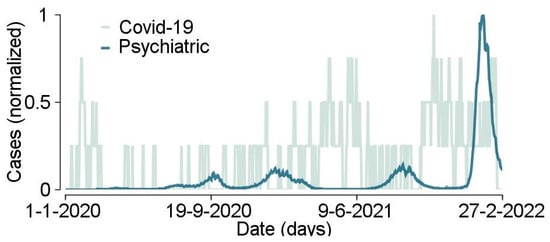The prevalence of normalized COVID-19 infection rates and suicide-related ER admissions rates is shown in Figure 1. The COVID-19 infection rates have a strong and clear oscillatory nature, a well-known phenomenon of infectious “waves” published in previous studies. The ER suicide behavior related admissions, by contrast, did not show a clear oscillatory nature of prominent and distinctive periods of elevation and depression.