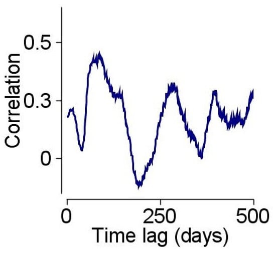 Time-lagged cross-correlation analysis of both filtered datasets, showing correlation rates by the phase of interval in timelines.