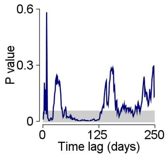 Granger causality analysis [24] also showed significant prediction rates for the same time lag found in the cross-correlation analysis (Figure 3). The p-value was significant (<0.05) between days 75 and 100, indicating that for this time lag, the prediction probability from infection rate to risk assessment rate is significant.