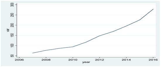 Premium of liability insurance of property insurance company (2007–2016, CNY 100 million). Data source: China National Bureau of Statistics.