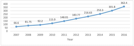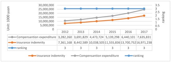 According to China’s compulsory liability insurance network for environmental pollution, the national environmental liability insurance premium income in 2016 was CNY 280 million (Data Source: China Environmental Pollution Liability Insurance Network: http://www.chinaepli.com/ (accessed on 31 December 2017), with over 4000 insurance companies. According to the statistics from the National Development and Reform Commission, by the first half of 2017, the total number of enterprises reached to 34,339 (Data Source: China Reporting Network: http://data.chinabaogao.com/ (accessed on 31 December 2017). Here is a rough calculation of the loss of environmental liability insurance. Accordingly, environmental liability insurance compensation/liability insurance compensation = environmental liability insurance premiums/liability insurance premiums * liability insurance compensation/liability insurance premiums. The amount of environmental liability insurance compensation for the past years is presented in Table 2, which is calculated based on Table 1.