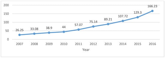 Compensation of liability insurance of property insurance company (2007–2016, CNY 100 million). Data source: China National Bureau of Statistics.