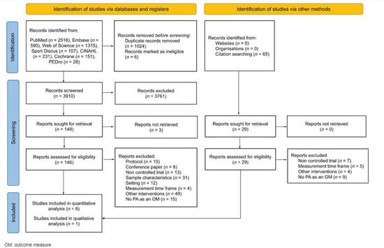 The systematic literature searches yielded 3910 references after the removal of duplicates and ineligible records. Moreover, sixty-five potential studies were detected in the article reference lists. When the title and abstract were screened, 175 eligible studies remained for full-text screening. Due to different reasons, 166 references were excluded (protocols, conference papers, non-controlled trials, excluded samples of participants, setting differing from school, different measurement time frames, other interventions or studies not assessing PA, MVPA and/or SB as outcome measures). Finally, nine studies were included: eight for quantitative analysis [26,27,28,29,30,31,32,33] and one for qualitative analysis [34]. The included studies were published between 2009 and 2020 (Figure 1).