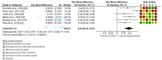 In-school PA was measured in six studies [26,27,28,29,31,32]. The meta-analysis revealed that interrupting prolonged sitting with active-based interventions let to a significant improvement in in-school PA (SMD = 0.46; 95% CI: 0.28, 0.64; I²: 52%) (Figure 2).